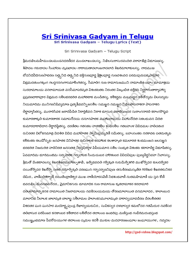 Srinivasa Gadyam Lyrics : 100%(1)100% found this document useful (1 vote). Srinivasa Gadyam Lyrics / Lord balaji slokas and mantras with lyrics on our channel.